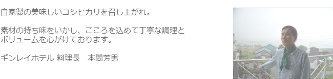 自家製の魚沼産コシヒカリをはじめ素材にこだわった美味しい料理と温泉でリラックスください。